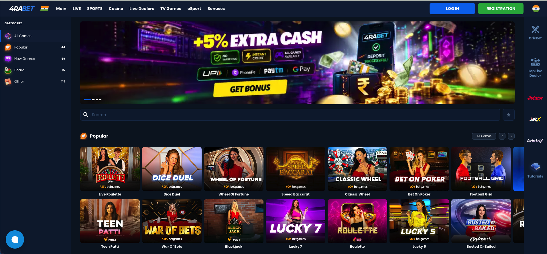4Rabet India brings sports betting and casino entertainment together under one roof. Access cricket markets, 30+ sports disciplines, and a library of 4,000+ casino games from your phone or desktop. Registration takes under a minute. Deposits start from 300 INR. Whether you follow IPL ball by ball or prefer spinning slots at midnight, everything is here in a single account.